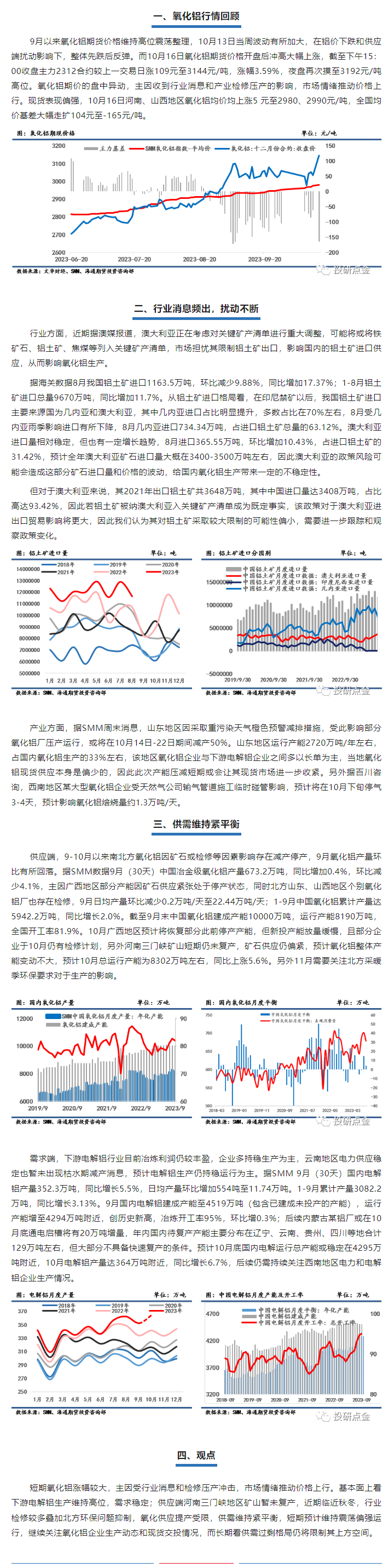基本面上看,下游电解铝生产维持高位,需求稳定;供应端河南三门峡地区矿山暂未复产,近期临近秋冬,行业检修较多叠加北方环保问题抑制,氧化供应提产受限,供需维持紧平衡,预计震荡偏强运行,继续关注氧化铝企业生产动态和现货交投情况,而长期看供需过剩格局仍将限制其上方空间。