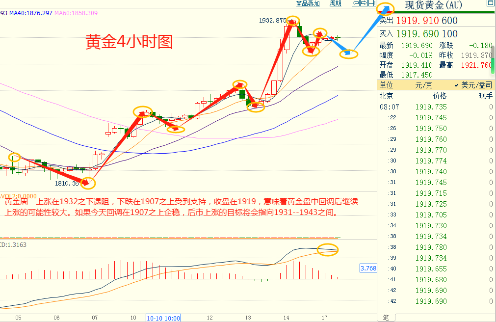 黄金周一下跌在1907.00之上受到支持,上涨在1932.00之下遇阻,意味着黄金短线下跌后有可能保持上涨的走势。如果黄金今天下跌在1907.00之上受到支持,后市上涨的目标将会指向1931.00--1943.00之间。今天黄金短线阻力在1930.00--1931.00,短线重要阻力1942.00--1943.00。今天黄金短线支持在1907.00--1908.00,短线重要支持在1895.00--1896.00。