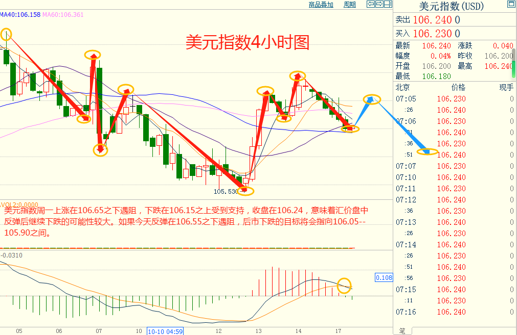 美指周一上涨在106.65之下遇阻,下跌在106.15之上受到支持,意味着美元短线上涨后有可能保持下跌的走势。如果美指今天上涨在106.55之下遇阻,后市下跌的目标将会指向106.05--105.90之间。今天美指短线阻力在106.50--106.55,短线重要阻力在106.75--106.80。今天美指短线支持在106.05--106.10,短线重要支持在105.90--105.95。