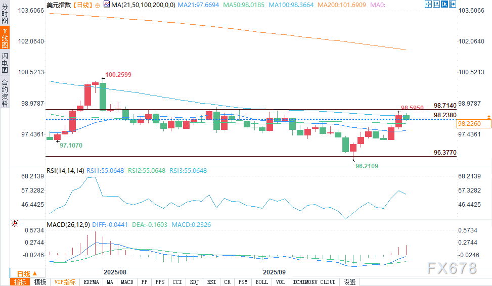 周五(9月26日),8月核心个人消费支出物价指数(核心PCE)数据公布后,尽管通胀黏性仍在且消费者支出超出预期,美元指数(DXY)仍小幅走弱。该指数从日内高点98.605回落,此点位略低于98.635和98.834的双重峰值阻力位,反映出市场在关键技术位附近的犹豫情绪。