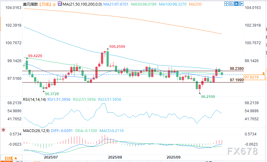 周一(9月29日)美盘时段,美国美元指数(DXY)跌破50日均线,跌幅0.32%,收于97.774。交易员在评估逼近的政府停摆风险,同时也在关注一系列美国经济数据的发布。