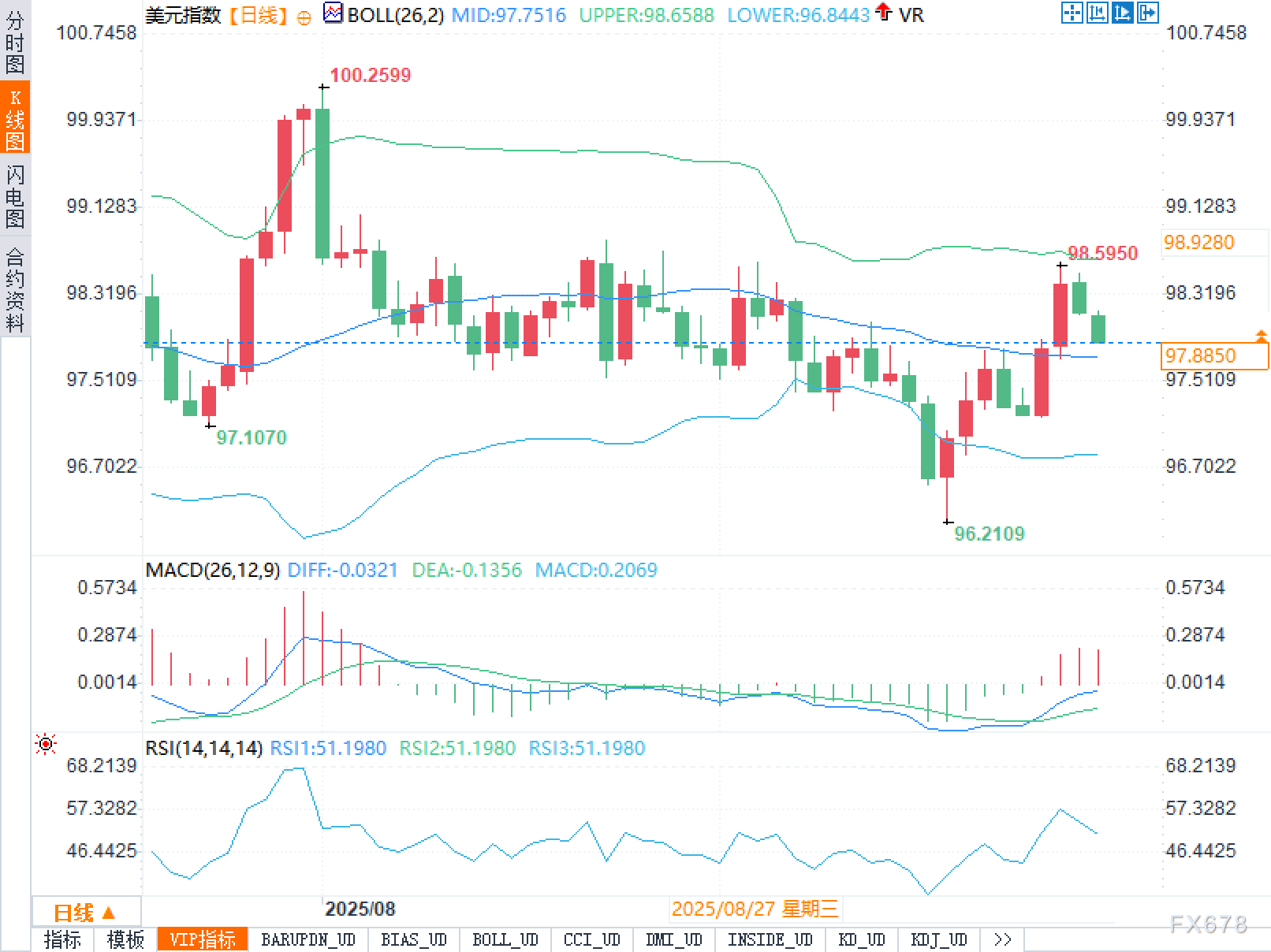 日线图显示,布林带中轨位于97.7516,上轨98.6588,下轨96.8443;当前价基本贴近中轨,处于“冲高受阻后的均值回归”阶段。近端K线自96.2109形成阶段低点后,快速拉升至98.5950一线未能突破上轨,随后回撤并在中轨附近震荡。指标共振方面:
