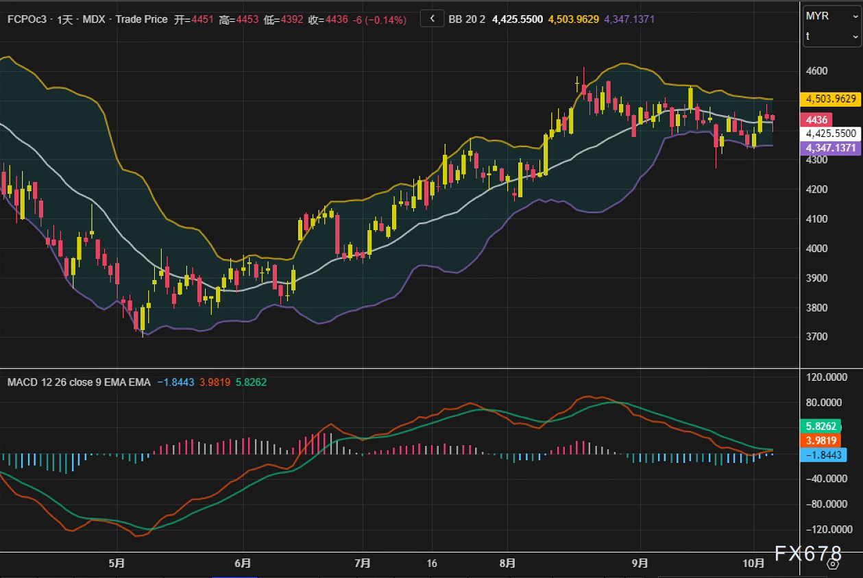 周一(10月6日),马来西亚衍生品交易所棕榈油主力合约FCPOc3收于4436林吉特/吨,日内下跌6林吉特,跌幅0.14%,延续前一交易日的疲软态势。日线图上,布林带中轨位于4503.96林吉特,MACD指标虽仍处负值区间,但柱状线收窄至-1.84,暗示短期下行动能有所减弱。