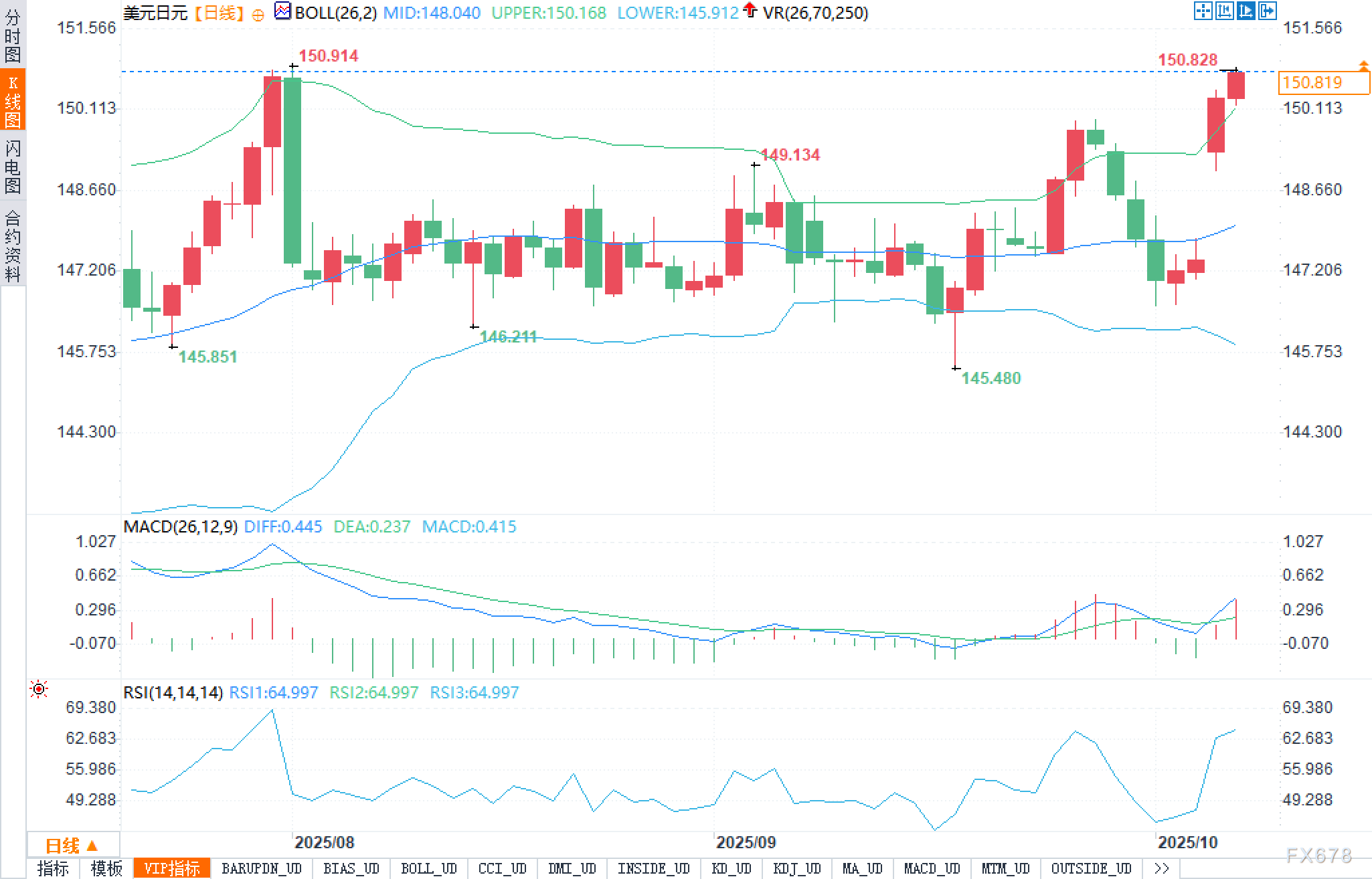 周二(10月7日),欧洲时段美元兑日元延续走强至150.50上方。汇价跟随美元整体上涨而抬升;与此同时,日元继续明显跑输主要货币,市场围绕日本新任首相高市早苗的政策取向重估日本央行的后续路径。