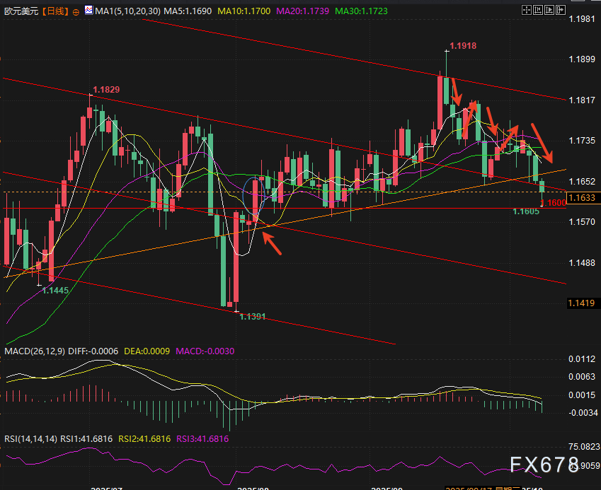 周三欧洲交易时段,欧元兑美元延续承压态势,继周二下跌约0.5%后,汇率继续下探一度跌至1.1600附近跌幅-0.44%,目前反弹至1.1635附近,跌幅收窄至-0.18%。从技术面逻辑来看,短期内卖方大概率仍将主导市场节奏。欧洲央行穆勒表态下午表示当前通胀水平已处于我们的目标区间内,削弱了短期加息的可能。除此之外当前压制欧元走势的因素总结如下。