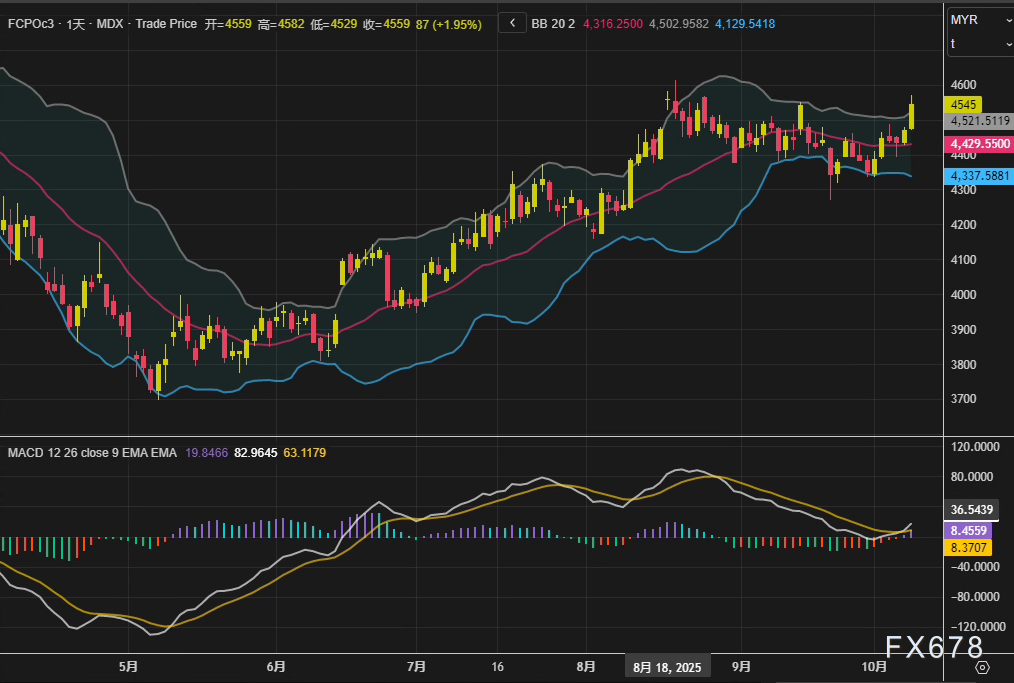 周三(10月8日),马来西亚衍生品交易所棕榈油主力合约FCPOc3收于4546林吉特/吨,单日大幅上涨76林吉特,涨幅达1.7%,创下自8月18日以来的最高收盘价。技术面上,布林带上轨已上移至4503林吉特附近,而MACD柱状线扩大至63.12,显示市场做多动能显著增强。