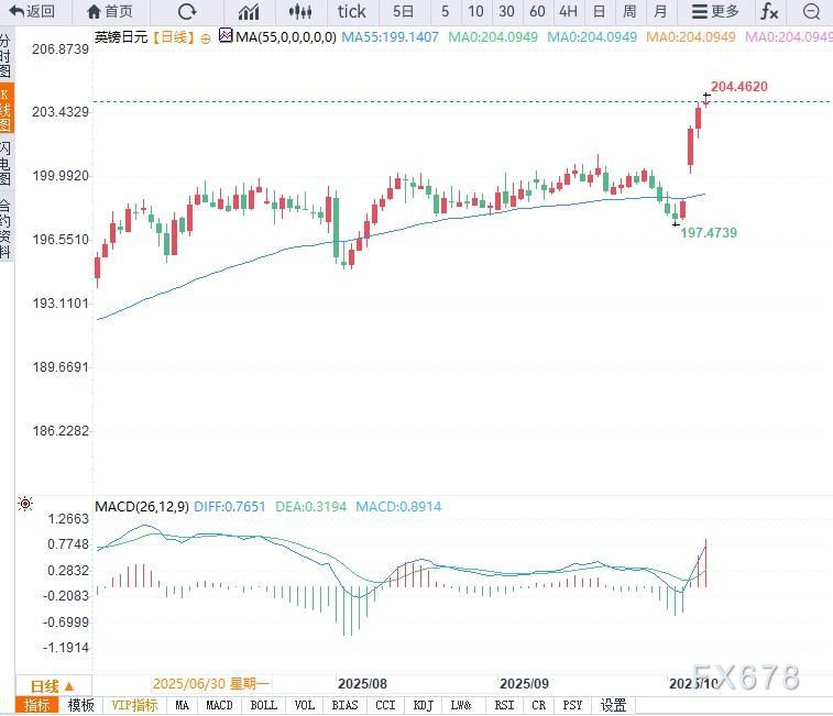 从技术面看,GBP/JPY已连续第四个交易日收阳,突破204.00关口后动能仍强。短期均线系统呈多头排列,MACD保持正向扩散,显示买盘占优。