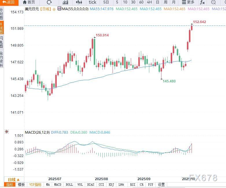 从技术结构看,USD/JPY 已经突破多条短期阻力线,并向 152.00–152.50 区间攀升。若能进一步突破该区间,则下一个目标可看向 153.00 区间。