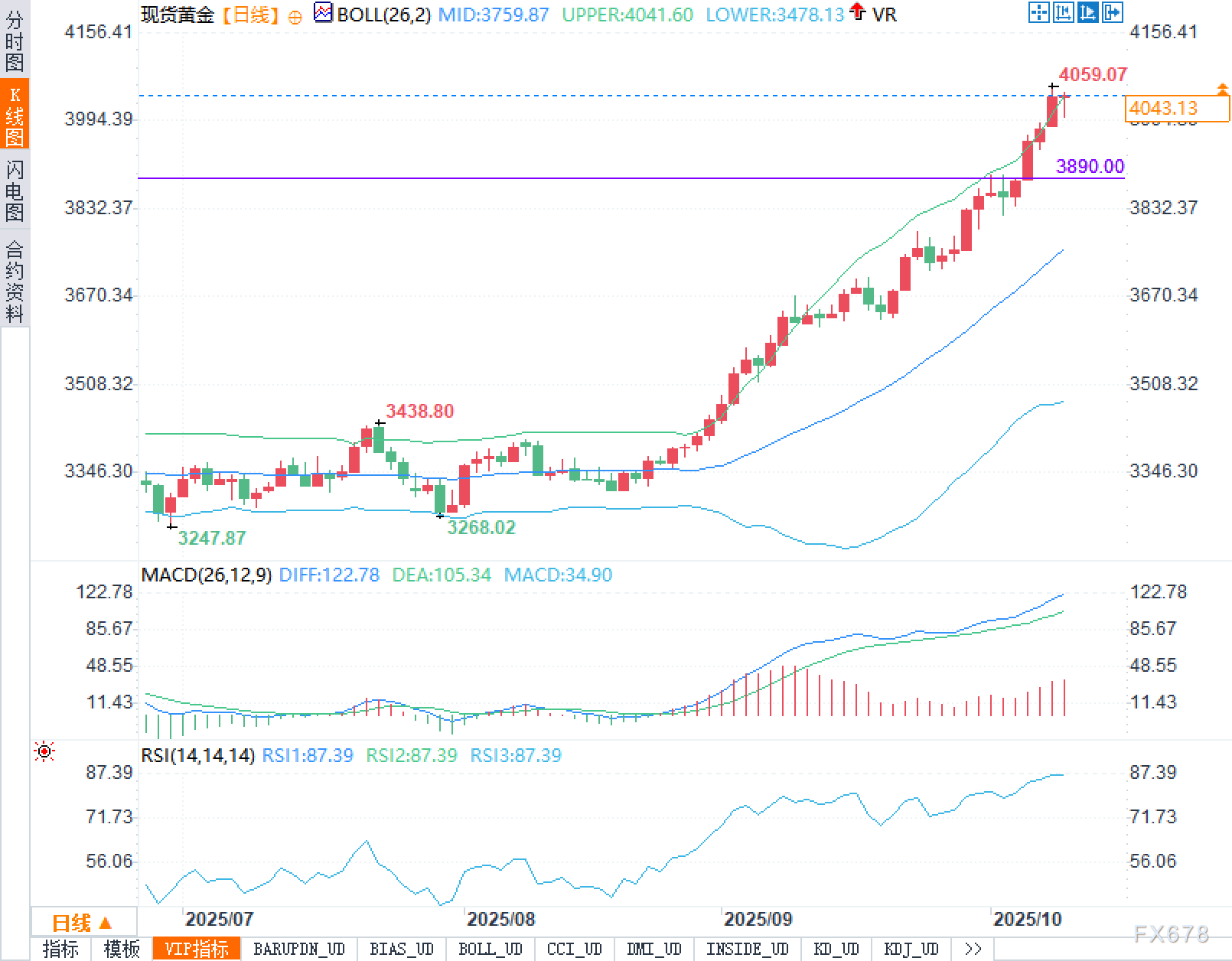 日线图显示,现货黄金自9月中下旬起走出强势上升通道,近期呈现“布林带行走”。布林上轨4041.60、布林中轨3759.87、布林下轨3478.13;当前价运行在上轨之上,表明趋势强、动能足,但也提示短线“超涨—均值回归”风险在累积。横向价位上,3890.00成为近端静态支撑,既是突破后的回测参考,也是行情维持多头结构的门槛;更下方的中轨3759.87是中期趋势强弱分界。