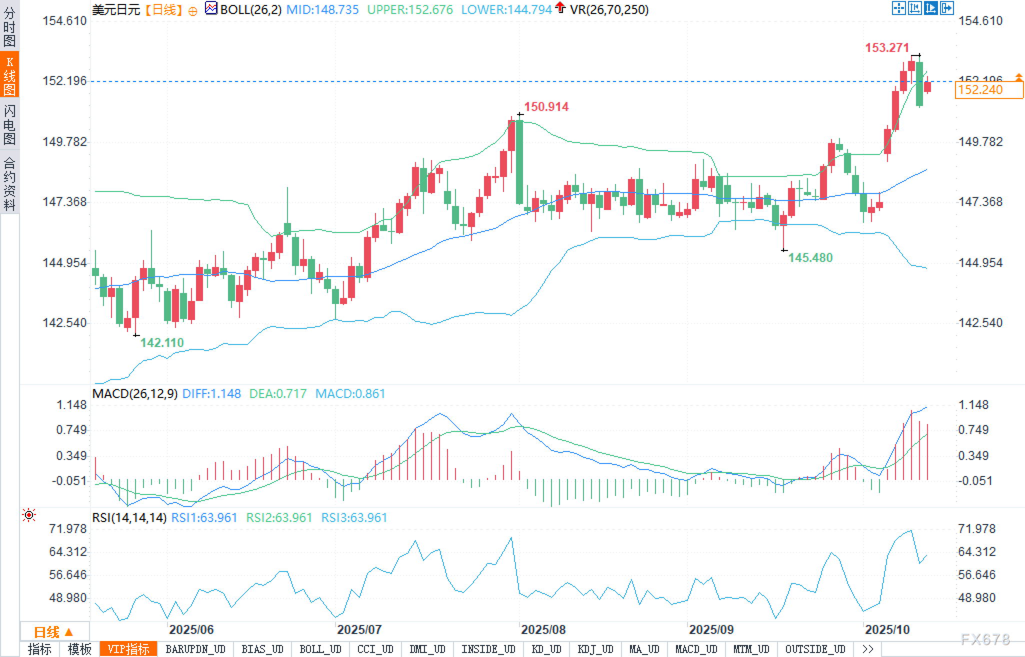 当前日线图上,布林中轨位于148.735,上轨152.676,下轨144.794。汇价运行在中轨之上、上轨之下,属于典型的“强势通道内高位整理”。近期高点153.271标注清晰,前期强势峰值150.914为重要回撤参照;更下方的阶段性低点分别为145.480与更早的142.110。就动量结构而言,MACD(26,12,9)显示DIFF=1.148高于DEA=0.717,柱状图为0.861,处于正值扩张区间,说明中期多头动能仍在释放但已接近前期峰值区域;RSI(14)读数约63.961,位于多头区而未触及典型超买阈(70附近),提示“强势但不极端”。