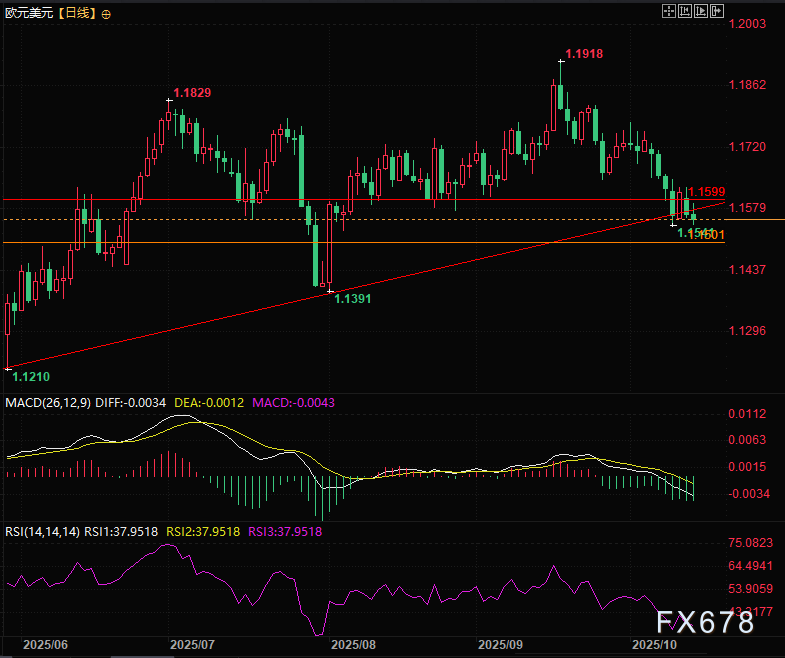 由于缺乏最新通胀及就业数据支撑,交易员只得依赖政策制定者的前瞻性指引。市场普遍预期,美联储将在10月29日会议上降息25个基点,期货市场隐含的降息概率高达98.34%,且预计12月将再启一次降息。尽管这一预期抑制了美元上行空间,但与此同时,鉴于欧元区经济增长动能显著弱于美国,欧元兑美元汇率仍被锚定在1.1600下方。