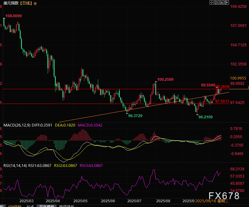 受欧元指数疲弱影响,美元指数保持强势,之前文章分析过,美元指数站上橙色颈线已经化解了头肩顶大形态的危机,这里可能会突破99.50附近重要关口,同时这个点位是美元指数全面翻多的重要标志,也标志着市场持续在加码对风险的定价。