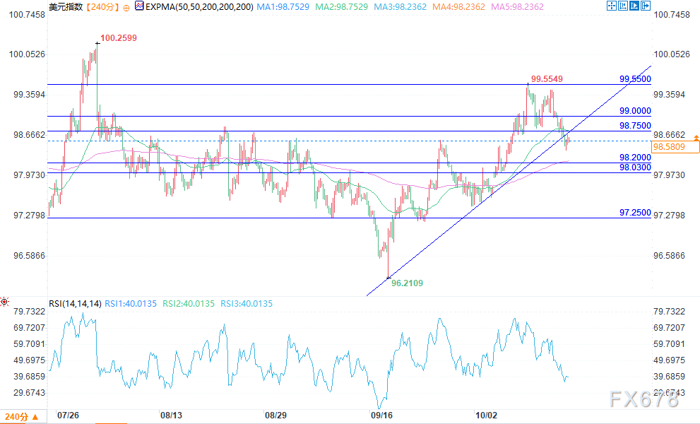 周四(10月16日)欧洲交易时段,美元指数跌至98.58附近,创一周新低,这是美元指数连续第三个交易日下跌。由于交易员预期美联储将采取更为温和的立场,且持续关注政治与贸易领域的动态,美元始终面临压力。