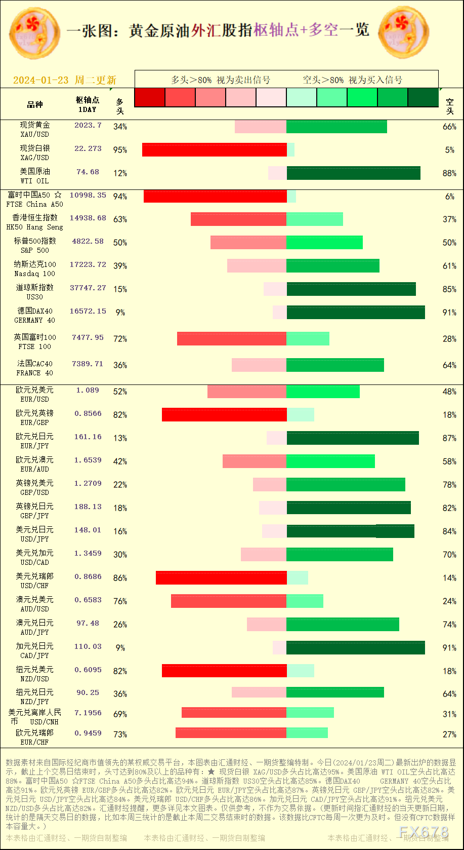 一张图:黄金原油外汇股指"枢纽点+多空占比"一览。今日(2024/01/23周二)最新出炉的数据显示,截止上个交易日结束时,头寸达到80%及以上的品种有:★ 现货白银 XAG/USD多头占比高达95%。美国原油 WTI OIL空头占比高达88%。富时中国A50 ☆FTSE China A50多头占比高达94%。道琼斯指数 US30空头占比高达85%。德国DAX40GERMANY 40空头占比高达91%。欧元兑英镑 EUR/GBP多头占比高达82%。欧元兑日元 EUR/JPY空头占比高达87%。英镑兑日元 GBP/JPY空头占比高达82%。美元兑日元 USD/JPY空头占比高达84%。美元兑瑞郎 USD/CHF多头占比高达86%。加元兑日元 CAD/JPY空头占比高达91%。纽元兑美元 NZD/USD多头占比高达82%。汇通财经提醒,更多详见本文图表。仅供参考,不作为交易依据。