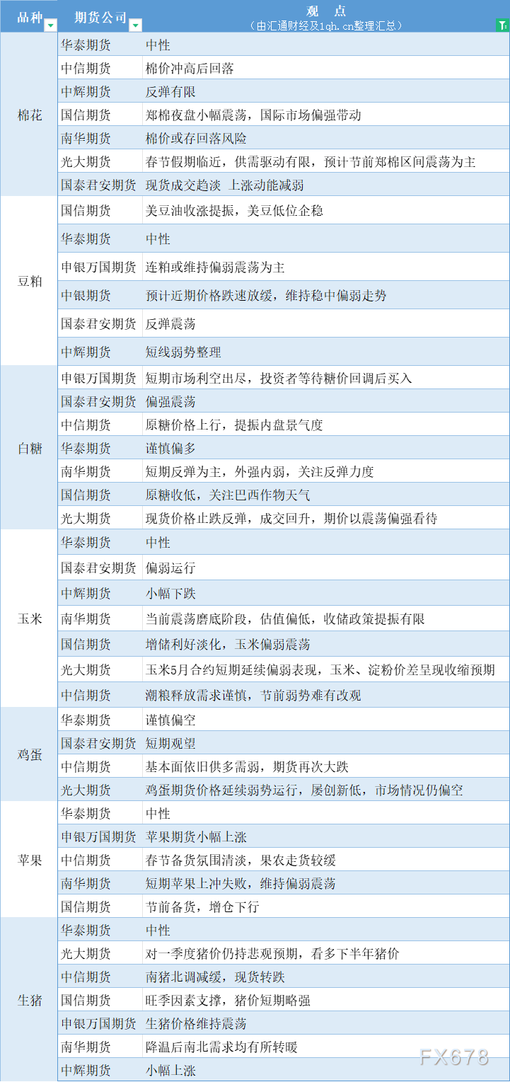 期货公司观点汇总一张图:1月23日农产品(棉花、豆粕、白糖、玉米、鸡蛋、生猪等)