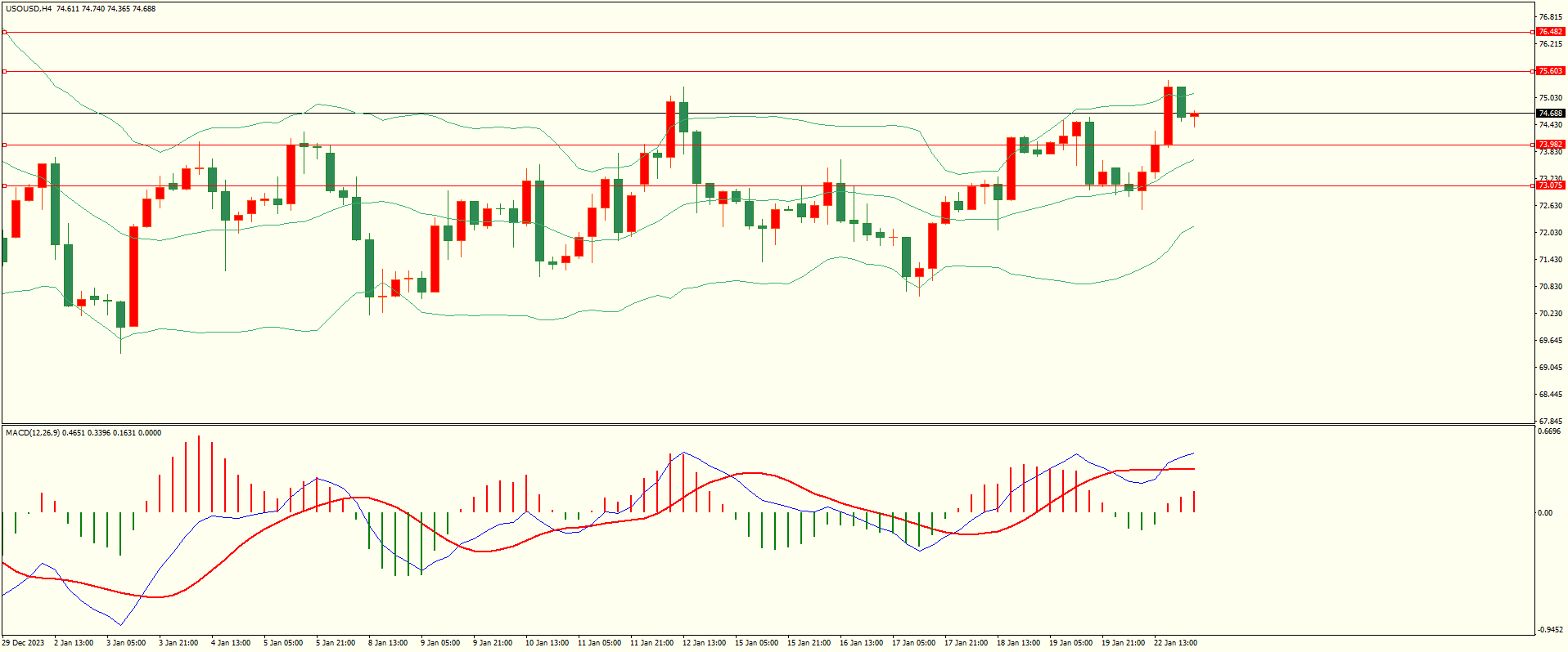 原油昨日回调至第一支撑上方震荡上行,至收盘续创日内新高,日线报收上下影线中阳线,目前上方紧邻前密集压力区,突破后方可继续,从4H来看,布林中轨偏上,MACD零轴上方运行,日内下方首要支撑73.95,第二支撑73.00,上方阻力75.60,76.40-50,保持在第一支撑上方短线有望测试第一阻力。