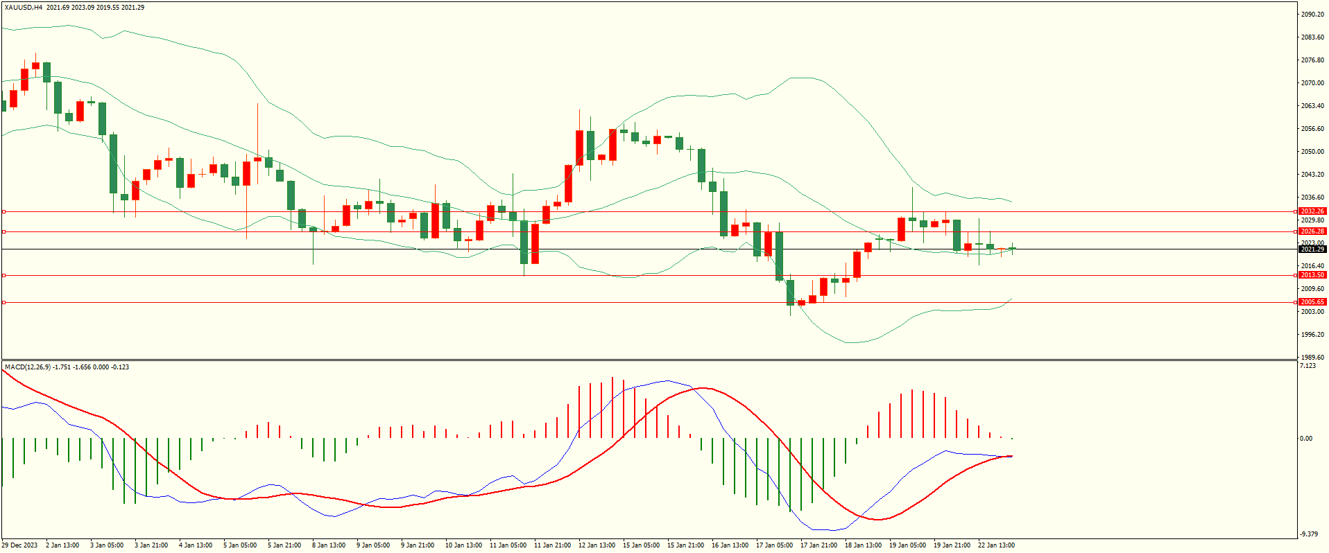 黄金昨日回调至第一支撑展开反弹,但上方空间受限,日线报收上下影线小阴线,从收盘来看,上方阻力并未收复,同时下方面临多重支撑,短线的多空争夺将继续,结合4H来看,布林上下轨略有收窄,MACD零轴下方运行,日内上方首要阻力2026-27,第二阻力2032-33,下方支撑2013,2005,第一阻力在没有收复前短线有望测试第一支撑。