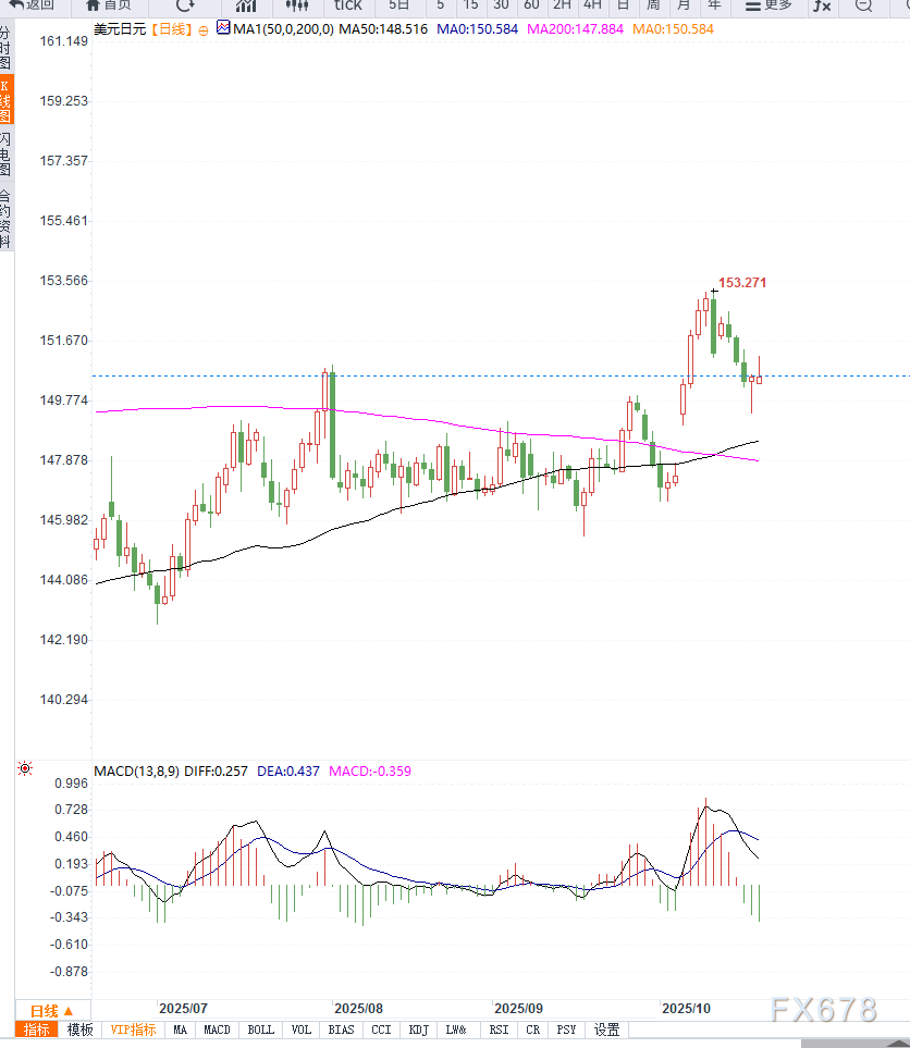 从日线图来看,USD/JPY 近期在 152.00 附近遇到明显阻力,多次冲高未能突破,形成高位震荡格局。下方支撑集中在 150.50–150.00 区间,若有效下破,可能开启回落至 149.40–149.35区间的调整。