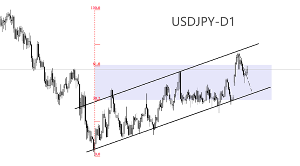 技术走势看,USDJPY处于中期上涨趋势之中,K线处于图中通道内部。虽然过去三个交易日USDJPY连续上涨,但由于此前已经触及通道上轨,当前正向下轨运动,所以短期涨势可能很快迎来阻力。图中紫色区域是标志性下跌波段的黄金分割区间,中期反弹走势的最高点已经超出区间上涨,反弹充分,未来有可能出现长周期的顺势下跌走势。