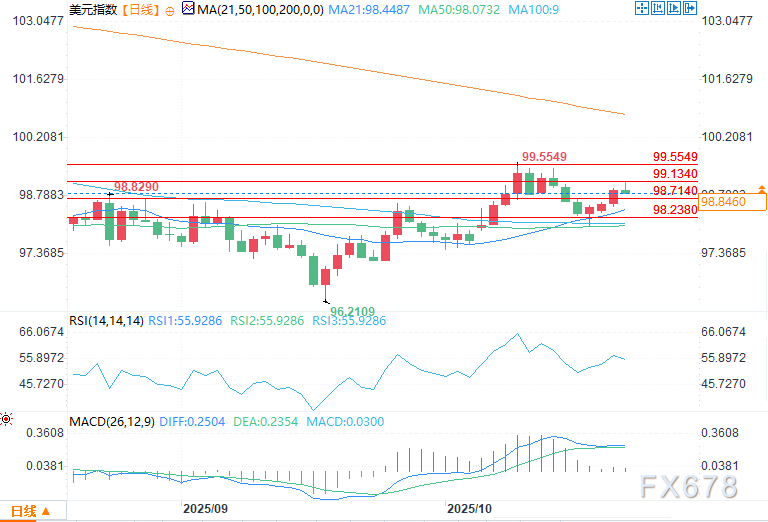 周三(10月22日)美盘时段,美元指数(DXY)盘中小幅走低,跌幅0.09%,报98.864。近期的上涨行情在关键支撑区间附近暂歇,因美国政府停摆导致经济数据发布中断,交易员态度谨慎,周五延迟公布的CPI报告成为下一个决定走势的重要因素。