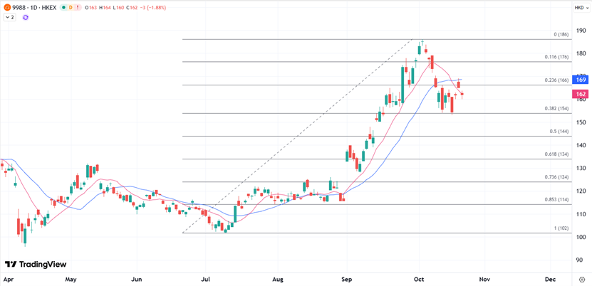 在市场看好公司云计算和人工智能业务的增长前景改善下,阿里巴巴已成为9月港股市场表现最佳的科技股巨头,当月累计上涨53%,9月份,南向资金净买入阿里巴巴股票共计610亿港元,是今年迄今为止单月净买入量最高的一个月。10月份股价则部分跟随国际贸易形势带来的影响而出现回吐,本月刷新2021年8月以来高位后倒跌逾8%。