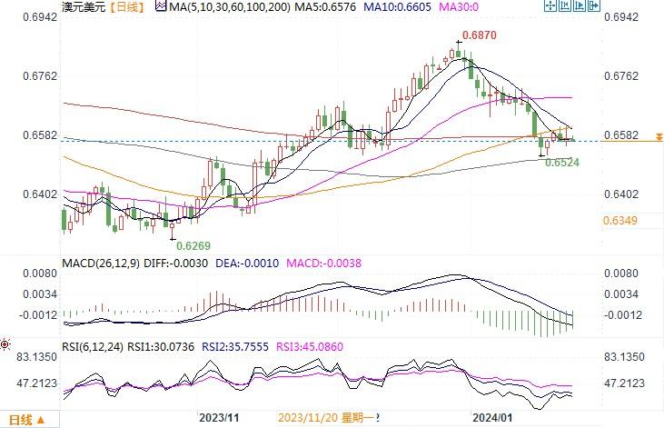 周二(1月23日),澳元/美元略止跌,持稳于0.6578水平附近。近期因为美国3月降息的希望消退,美元保持强势,一直给到澳元下行的压力。不过,上周五全球股市在科技股的推动下出现反弹,风险偏好情绪有所改善,给澳元带来了些许的喘息之机。然而更大程度上,澳元/美元周二的走势更像是技术上的空头回补调整而已。短线小时图上,澳元/美元进入超卖回补调整走势形态,目前上方0.66附近构成初步的阻力,进一步在0.6615附近,若能清除上述阻力水平,澳元/美元或有望在反复整理后产生回升的走势行情。相反,澳元将延续跌势,而且一旦跌穿0.65强支撑水平,后续跌幅将会扩大。