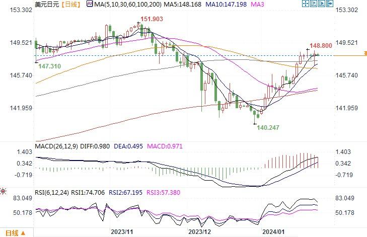 周二(1月23日),美元兑一篮子货币周二攀升至六周最高,因美国经济仍然稳定,市场仍预计美联储不会急于降息,投资者在短暂喘息后重启美元买盘。美元兑日元上涨,纽约盘尾上涨0.2%,报148.38。此前日本央行在政策会议上一如预期维持超宽松政策不变,但暗示将在4月退出负利率。日本央行总裁植田确实指出在实现通胀目标方面取得了进展,但他拒绝透露这一进展有多接近目标,强调日本央行将继续依赖数据做出决策,并可能持续到4月份。即便如此,市场似乎不买账,植田的表态仍难以令市场确信日本央行4月份将会在结束负利率方面有真实的行动。为此,当前重启的套利交易似乎更愿意尝试继续推低日元。日线图上,美元兑日元继续处在小幅整理走势,技术指标略有钝化,但未显转向迹象。若上方穿越近期整理走势区间上限148.75水平,美元/日元有望冲击150关口水平。下方目前初步的支撑落在147.00附近。