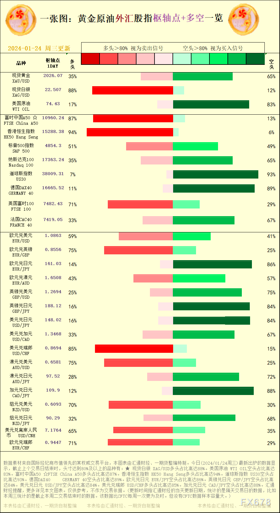 一张图:黄金原油外汇股指"枢纽点+多空占比"一览。今日(2024/01/24周三)最新出炉的数据显示,截止上个交易日结束时,头寸达到80%及以上的品种有:★ 现货白银 XAG/USD多头占比高达88%。美国原油 WTI OIL空头占比高达83%。富时中国A50 ☆FTSE China A50多头占比高达87%。香港恒生指数 HK50 Hang Seng多头占比高达94%。道琼斯指数 US30空头占比高达93%。德国DAX40GERMANY 40空头占比高达89%。欧元兑日元 EUR/JPY空头占比高达86%。英镑兑日元 GBP/JPY空头占比高达84%。美元兑日元 USD/JPY空头占比高达84%。美元兑瑞郎 USD/CHF多头占比高达85%。加元兑日元 CAD/JPY空头占比高达88%。汇通财经提醒,更多详见本文图表。仅供参考,不作为交易依据。