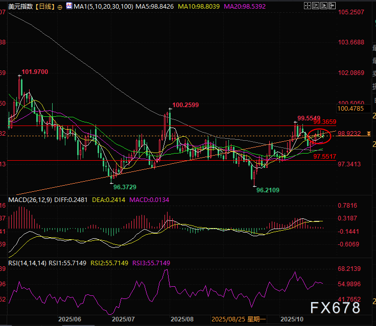 受此影响美元指数迅速下跌0.3%,目前交投于98.86附近,跌0.05%。