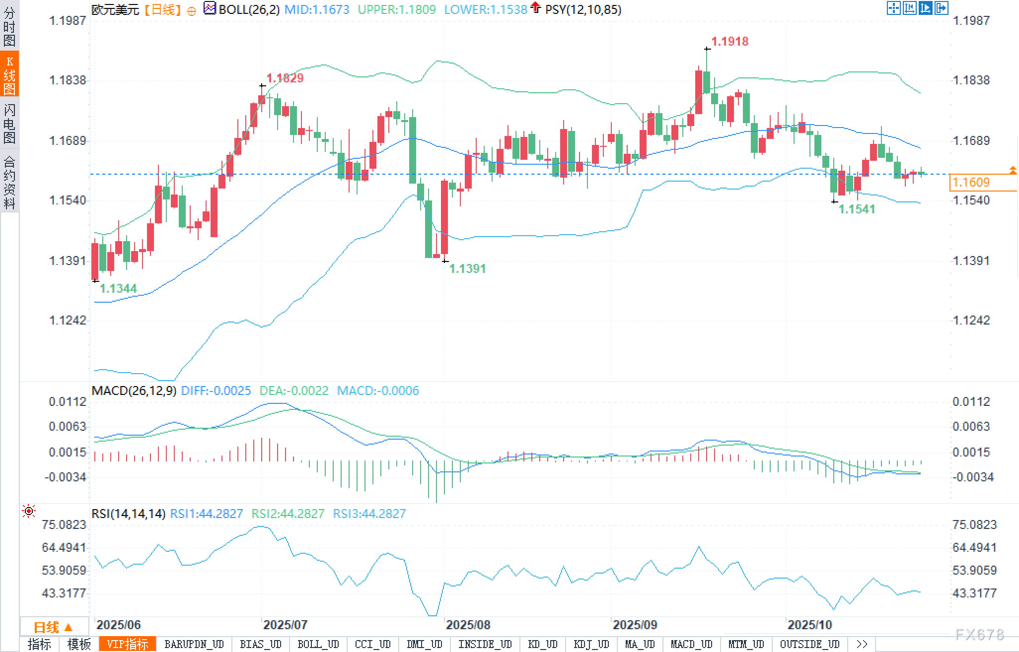 日线图显示,布林带中轨为1.1673,上轨1.1809,下轨1.1538。汇价当前运行在中轨下方、下轨上方的中下区域,显示“中性偏弱”的均值回归状态。近几日K线实体收窄、上影线频现,反映上方卖压在1.1630—1.1673区间依旧顽强。