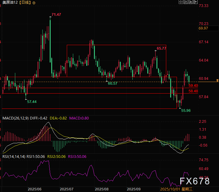 美原油12月期货合约快速反弹至箱体上沿后,展开回调,最近的支撑可以参考59.40,是10月10日阴线的50%分位,同时下一个支撑为58.48,这波油价突破的关键价位。