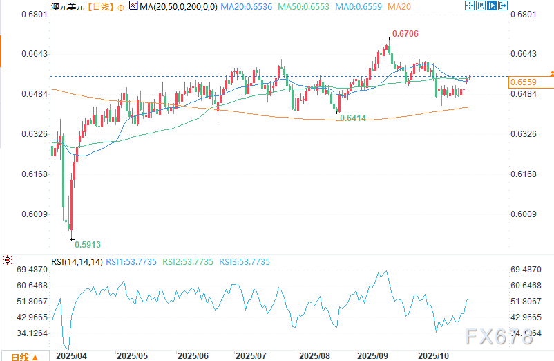 周二(10月28日)欧盘时段,澳元兑美元日内以震荡为主。近期贸易紧张局势缓解,且交易员正等待美国与澳大利亚的关键事件,澳元兑美元货币对跳空高开,攀升至10月10日以来的最高水平。该货币对从本月0.6440的低点上涨,最高触及0.6563。