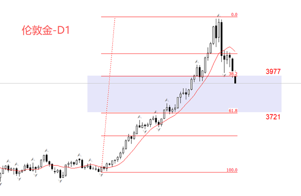 技术角度看,黄金日线在本月20日触顶,随后开启剧烈下跌。前一轮标志性上涨波段的0.382分位(3977美元)已经被跌破,继续下跌将考验0.618分位(3721美元)。在没有突发消息的情况下,考虑到下跌波段力度较强,0.618分位在中期内被触及的概率较高。