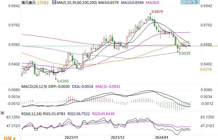 周三(1月24日),澳元兑美元在0.6575附近徘徊。进入新的一年后,由于交易商推迟了对美联储首次降息的预期时间,美元一直表现坚挺,澳元则受压一路下行,目前勉强守护在0.65水平之上。周三日内,尽管中国宣布降准的刺激经济发展的利好消息,且铁矿石价格上涨,但对澳元的刺激影响不大。当前市场关注的焦点还是放在美国周四、五的放映经济发展和通胀数据上。在左右澳元的走势中,美元的走势仍占主导影响。日线图上,澳元/美元仍处于布林带通道中轨线下方,汇价继续处于窄幅整理之中,技术指标下摆还在延续中,显示澳元的弱势格局未有改变。预料美国周四和周五所公布得GDP和核心个人消费支出(PCE)公布后,澳元/美元或有望走出窄幅整理走势的局面。
