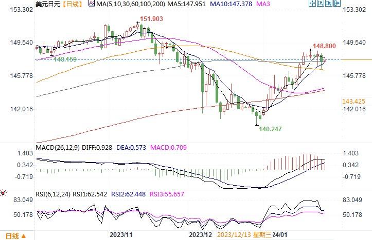 周三(1月24日),美元周三下跌,投资者目前正在关注周四将出炉的美国第四季度国内生产总值(GDP)初值,以及周五公布的另一项通胀数据--个人消费支出(PCE)物价数据。数据出炉之前,投资者整固头寸,美元近期涨势暂作喘息。美元兑日元当天下跌0.5%,收盘于147.58。 在日本央行总裁植田和男周二声称实现日本央行通胀目标的可能性正在逐步升高之后,日本公债收益率跃升至六周高点,日元则追随日债收益率走势略有回升。美元/日元后续走势则要视乎本周四、五美国重要经济数据的表现。若数据强劲,将进一步降低美元利率及早降息预期概率,美元/日元有极大机会继续修补2023年第四季跌势。相反,美元/日元可能再次呈现高位遇阻回落的行情。日线图上,美元/日元继续面临调整的风险,但隔夜带长尾线的阴柱体且收盘价继续拉上至147之上,表明美元多头暂时未有撤出的意愿。留意周四及周五美国数据公布结果对市场的扰动。