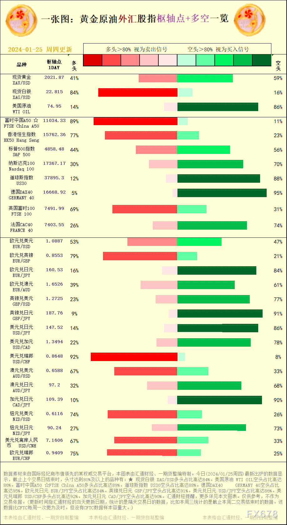 一张图:黄金原油外汇股指"枢纽点+多空占比"一览。今日(2024/01/25周四)最新出炉的数据显示,截止上个交易日结束时,头寸达到80%及以上的品种有:★ 现货白银 XAG/USD多头占比高达84%。美国原油 WTI OIL空头占比高达86%。富时中国A50 ☆FTSE China A50多头占比高达89%。道琼斯指数 US30空头占比高达88%。德国DAX40GERMANY 40空头占比高达95%。欧元兑日元 EUR/JPY空头占比高达84%。英镑兑日元 GBP/JPY空头占比高达91%。美元兑日元 USD/JPY空头占比高达86%。美元兑瑞郎 USD/CHF多头占比高达92%。加元兑日元 CAD/JPY空头占比高达90%。汇通财经提醒,更多详见本文图表。仅供参考,不作为交易依据。