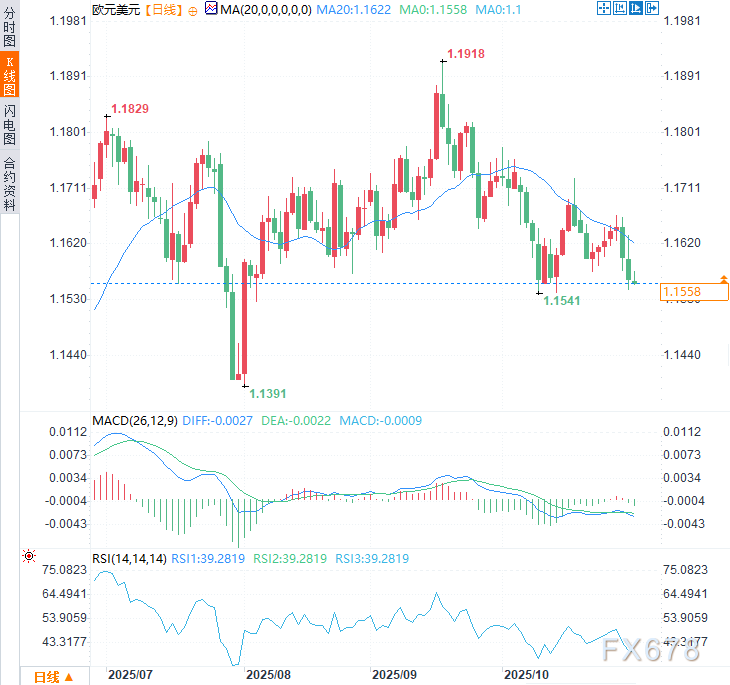 周五(10月31日)欧元兑美元交投于1.1560附近,市场表现谨慎。该主要货币对难以实现有效反弹,因美元在多重利好因素支撑下保持坚挺——市场对美联储鸽派立场的预期减弱,以及贸易摩擦持续改善。