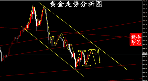 黄金早间强调4010-4030区间空思路正确!最低走到3962一线!可自行查验!目前次高点在4150.整体保持在台阶震荡下行通道中运行,晚间继续短线依托上轨做为阻力点。仍保持在上轨之下择机高空,目前留意下轨及此前的下探低点3883的破位情况,下破才能进一步打破空间,否则短线会收缩震荡,目前价格处于下跌阶段的低位震荡中,考虑逢上边界线附近继续做空。