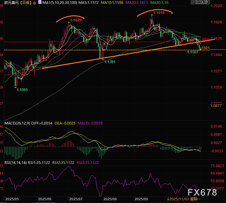 周一(11月3日)亚欧时段,欧元兑美元汇率继续向下修正,虽处于1.1530支撑位附近,但处境岌岌可危。