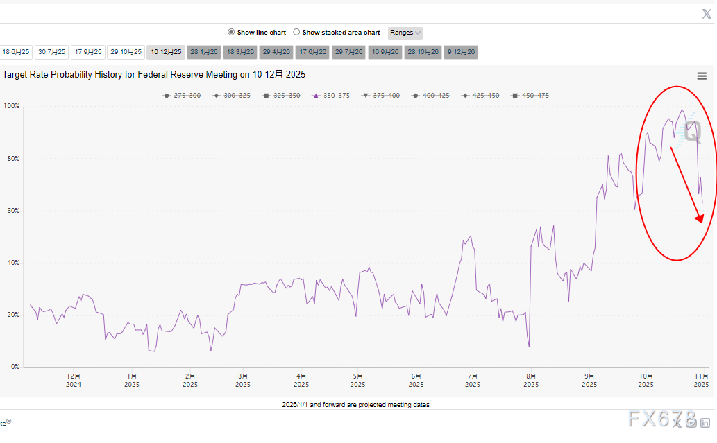 据芝加哥商品交易所(CME)美联储观察工具显示,市场对美联储12月降息25个基点的概率,已从美联储会议前的90%以上回落至周一的67%。