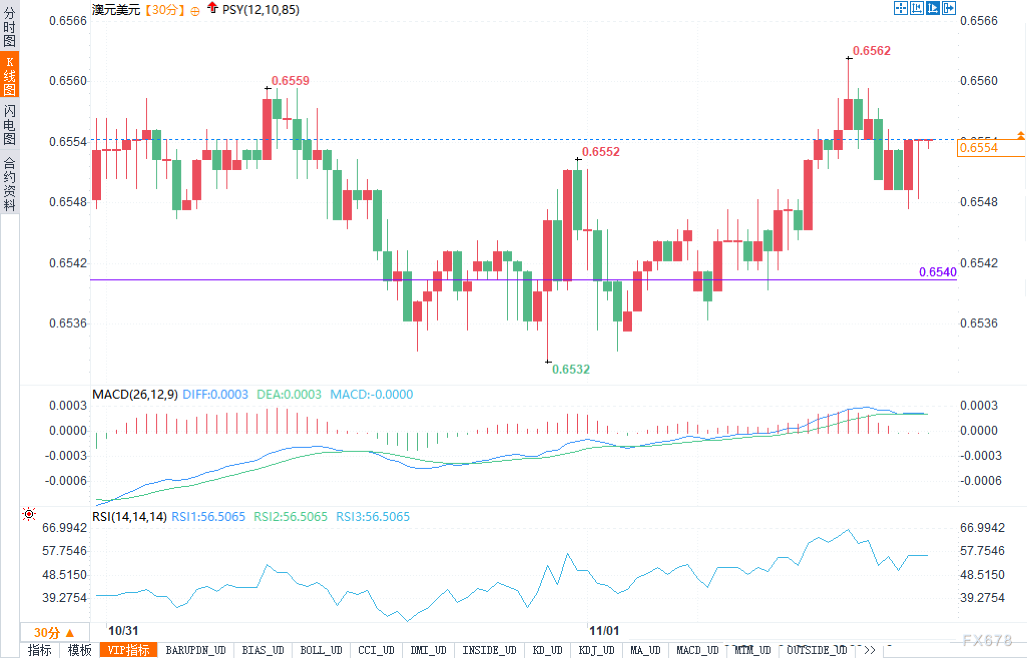 从30分钟K线图观察,澳元兑美元汇价当前运行于0.6540至0.6560的箱体区间内。价格结构上,汇价在0.6559和0.6562形成了双顶形态的雏形,这两个高点构成了短期阻力带。与此同时,0.6540的水平支撑线则成为多头的重要防线。