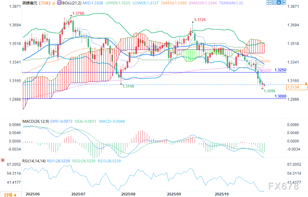 日线图显示,英镑/美元过去几个月持续下行,从9月1.3726的高点跌至当前的1.3096。