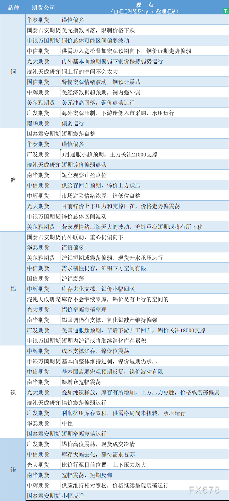 期货公司观点汇总一张图:10月18日有色系(铜、锌、铝、镍、锡等)
