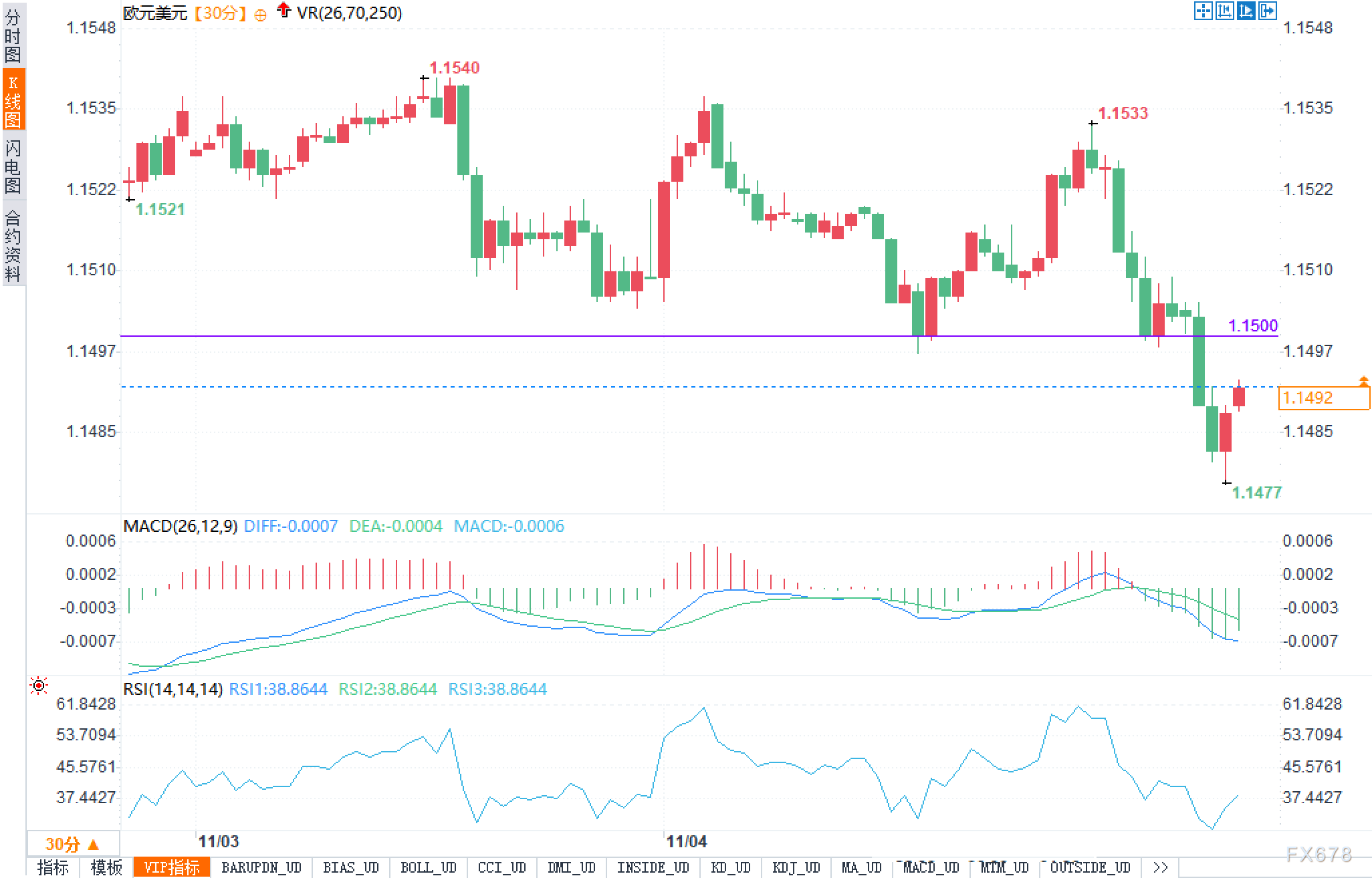 从30分钟K线观察,汇价在1.1530附近的反弹被迅速否决,随后跌破1.1500形成明确的下行突破,盘中最低触及1.1477后才有回抽。目前价格回到1.1492,仍位于1.1500下方的“阻力转支撑”之下,说明空头对短线节奏仍具掌控力。