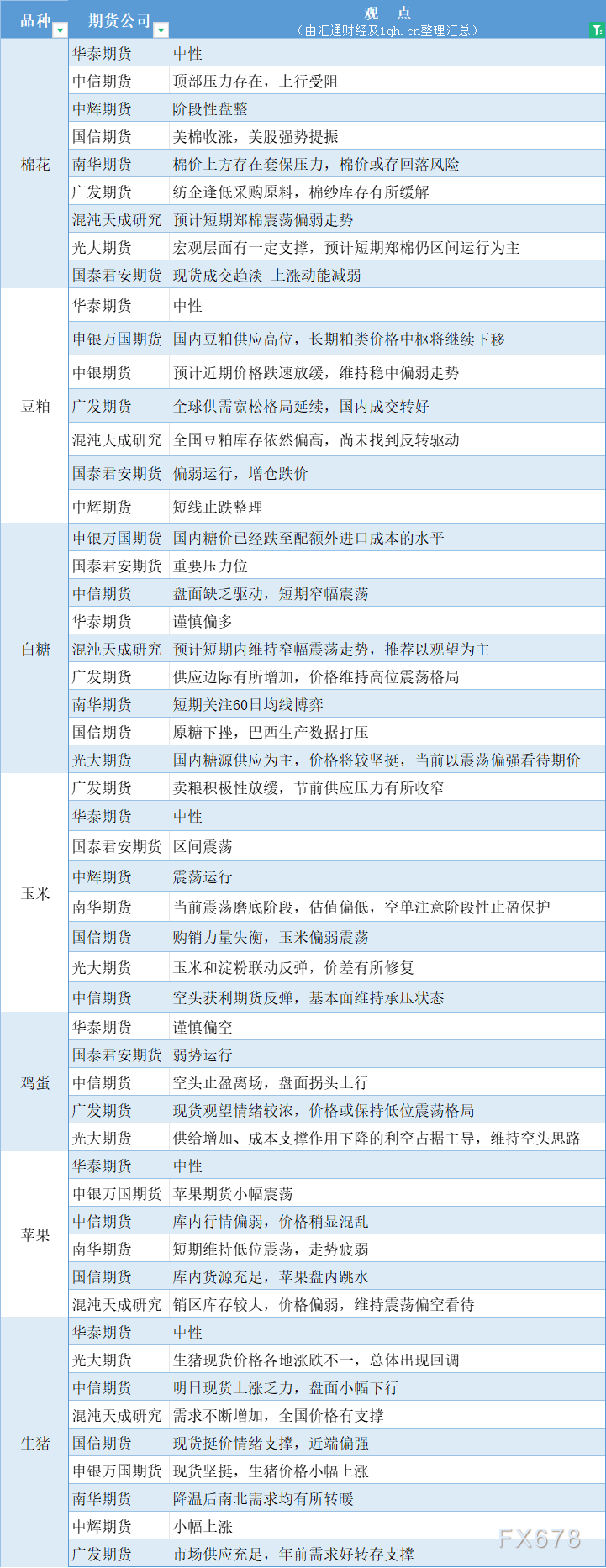 期货公司观点汇总一张图:1月26日农产品(棉花、豆粕、白糖、玉米、鸡蛋、生猪等)