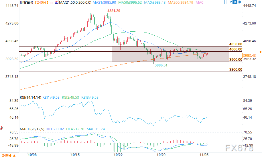 周三(11月5日),现货黄金在熟悉的区间内保持稳定。全球市场普遍呈现温和避险基调,为这种避险金属提供了需求支撑。现货黄金盘中报3981美元左右,从周二3928美元的低点小幅回升。