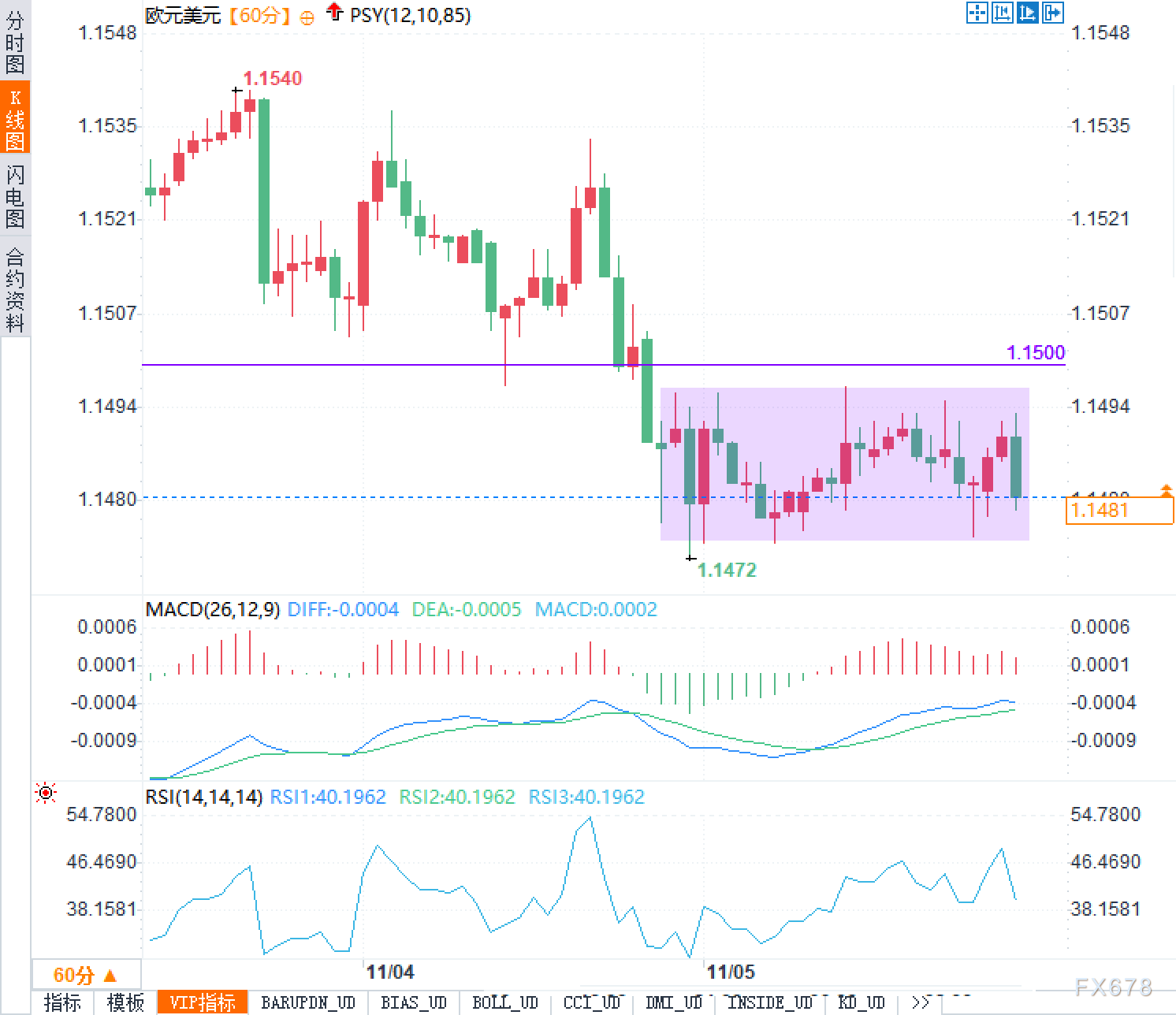 从60分钟K线图观察,欧元兑美元在经历前期从1.1540至1.1472的剧烈下挫后,目前在1.1470-1.1500区间内构筑箱体整理形态。1.1500作为关键心理关口和前期支撑转阻力位,对汇价形成明显压制。汇价多次试探该水平未能有效突破,显示上方抛压较重。箱体下沿1.1470构成短期重要支撑,该位置若失守将打开进一步下行空间。