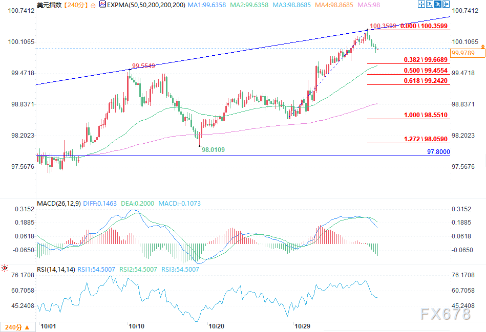 周四(11月6日)欧盘时段,美元指数(DXY)目前交投于99.95附近,在周三波动行情后小幅回落。随着交易员消化美国喜忧参半的经济数据,美元从近期高点回落,投资者则将注意力转向主要央行会议。