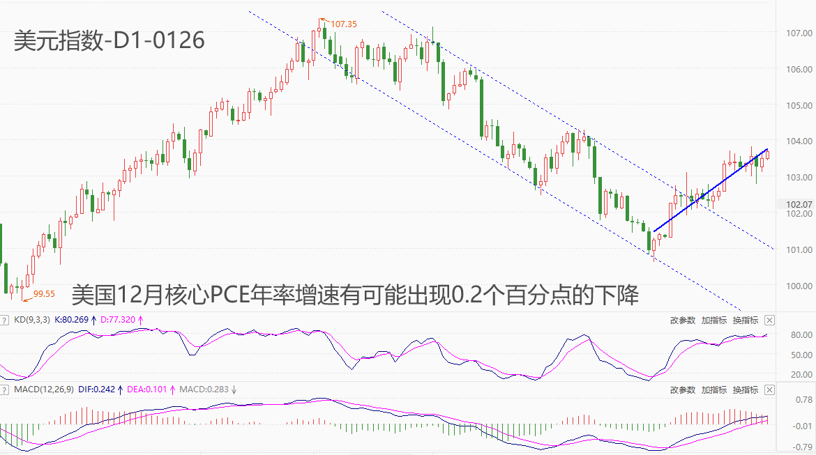 ATFX汇市:美国商务部将公布美国12月核心PCE物价指数年率,前值为3.2%,预期值3%,预期将下降0.2个百分点。同一时间还将公布美国12月名义PCE物价指数年率,前值为2.6%,预期将保持不变。美国PCE数据经常出现在美联储会议纪要当中,对美联储货币政策调整起到至关重要的作用。由于PCE数据在月末公布,所以准确性较高,但也存在滞后性强导致的行情影响性弱的问题。上周五公布的美国一年期通胀率预期从3.1%下降至2.9%,降幅0.2个百分点。1月11日公布的12月未季调核心CPI年率,从4%下降至3.9%,降幅0.1个百分点。两项前瞻性的通胀率指标都认为美国的12月份的通胀率将降低,所以市场预期12月核心PCE数据也将下降,预计准确率较高。通胀率下降意味着高通胀正在降温,美联储将一定程度上失去维持高利率的依据,降息预期将再次升温,利空美元指数。