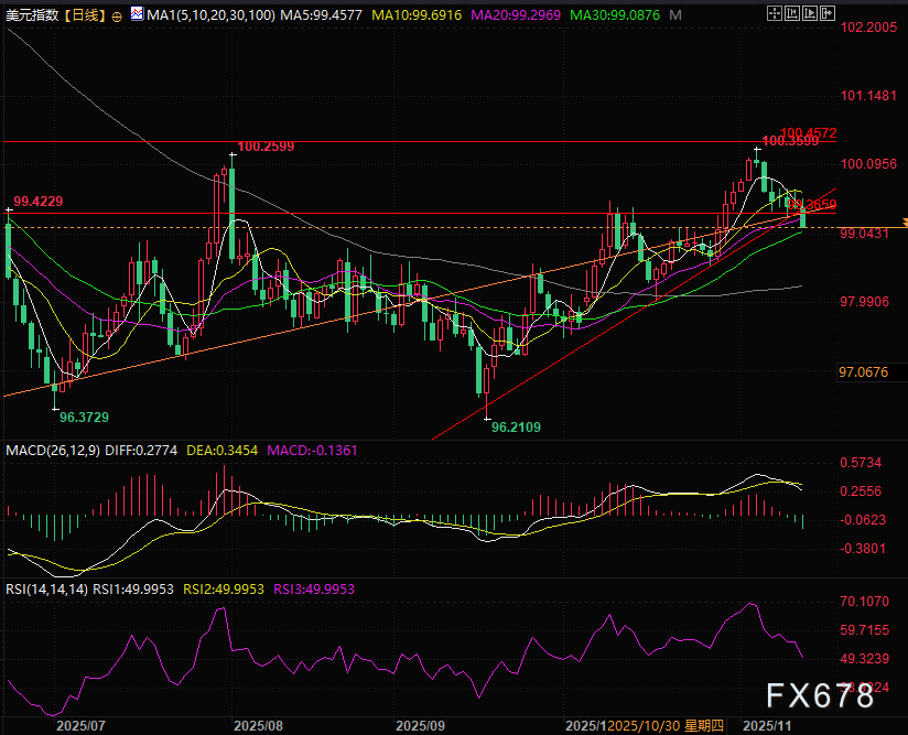 周四(11月13日)亚欧交易时段,美元指数超预期震荡走低,交投于99.18附近跌破了前期上升通道等多数支撑。美国总统唐纳德·特朗普签署政府拨款法案、终结创纪录43天政府停摆。